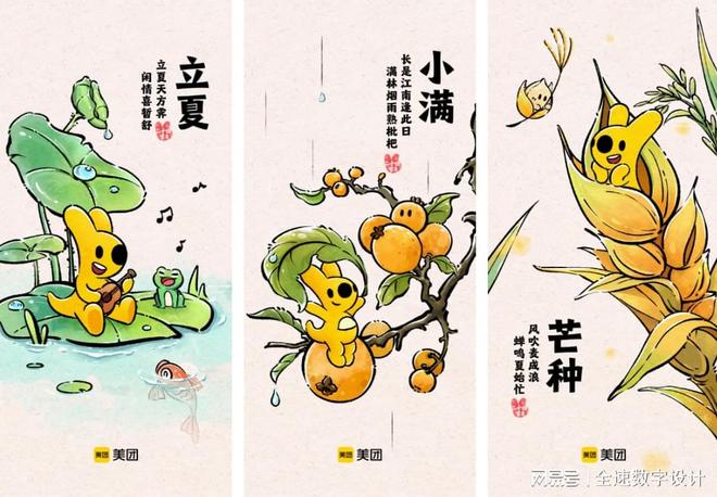 全速在为美团设计二十四节气插画海报时,通过仿水墨风的设计风格,融入节气特有的民俗及物候,营造节气氛围;文字搭配“长是江南逢此日,满林烟雨熟枇杷”“何似西窗谷雨茶,未知东郭清明酒”等诗意短句,传递节气文化内涵;在品牌关联方面,全速将美团IP“袋鼠团团”设定为“迷你版”,放入微观场景中,以动效设计增加画面趣味性,并将品牌LOGO+IP印章融入角落,强化品牌关联的同时避免喧宾夺主。
