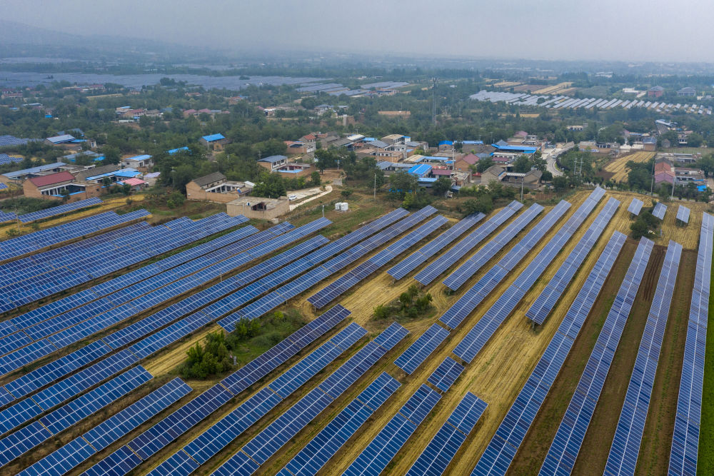 这是2025年6月25日在山西省运城市芮城县夭上村拍摄的光伏基地(无人机照片)。新华社记者 杨晨光 摄